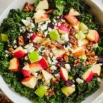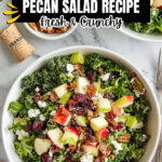 A vibrant and flavorful Apple Cranberry Pecan Salad featuring crispy bacon, tangy apple cider vinaigrette, fresh kale, sweet cranberries, creamy feta cheese, and homemade candied pecans. This salad offers a wonderful combination of textures and tastes, perfect for a nourishing lunch or a light dinner.