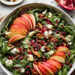 A vibrant Autumn Harvest Honeycrisp Apple and Feta Salad featuring toasted pecans, pumpkin seeds, crispy prosciutto, fresh arugula, juicy apples, creamy avocado, tangy pomegranate arils, and crumbled feta, all tossed in a flavorful apple vinaigrette for a perfect fall-inspired meal.