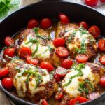Pop the skillet into your preheated 400°F oven and bake uncovered for about 18–23 minutes, or until the chicken’s internal temperature hits 165°F. The tomatoes will soften, and the mozzarella will melt into a gooey blanket that’s simply irresistible. Let the dish rest for 5 minutes after baking—that pause lets the juices settle so every bite is perfectly moist.
