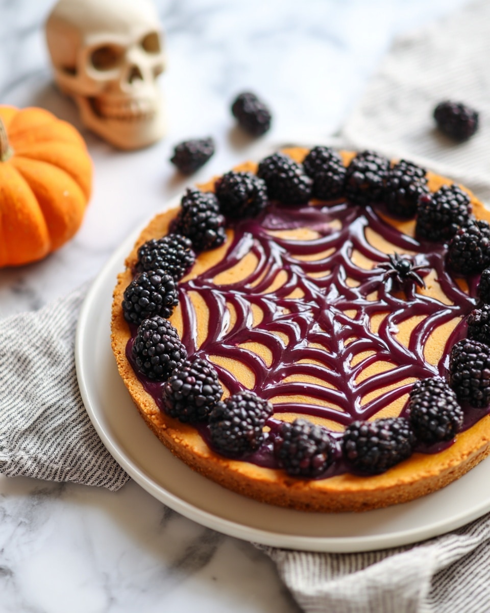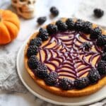 - Add toppings: Arrange blackberry halves around the edges of the tart. Optionally, for Halloween, decorate some blackberries as spiders by piping chocolate legs and adding nut butter eye balls.