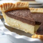 Bob Andy Pie, Southern dessert recipes, custard pie with spices, easy pie recipes, nostalgic dessert ideas - The image shows a slice of pie with three visible layers: a light golden brown flaky crust on the outer edge, a dark brown smooth but slightly porous custard-like filling in the middle, and a thin crust base under the filling. The slice is held above the remaining pie on a silver pie server, revealing the same dark brown custard filling and crust around the edges in a white pie dish. The pie and slice sit on a white marbled surface. Photo taken with an iphone --ar 2:3 --v 7