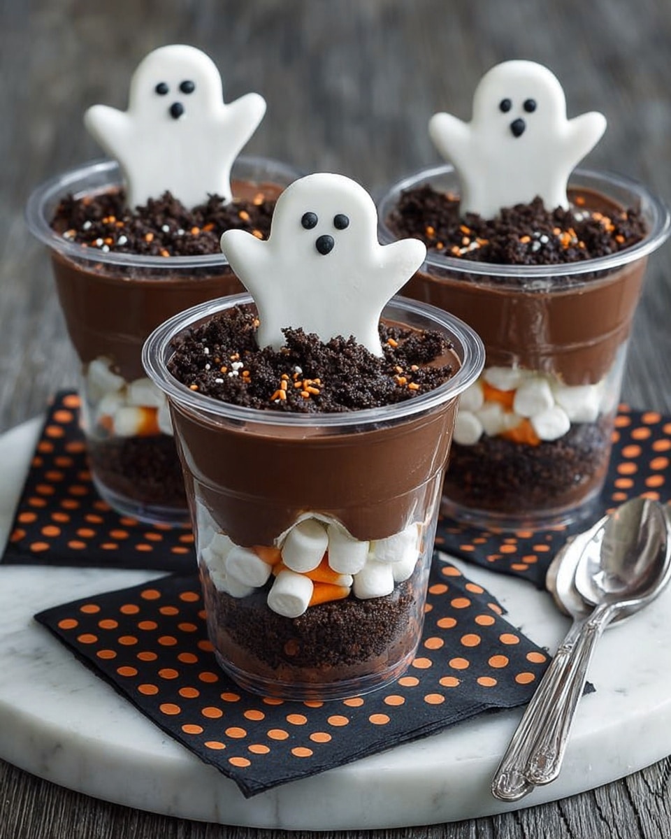 The image shows three clear plastic cups filled with layered dessert. Each cup has a bottom layer of dark crumbly cookie pieces, followed by small white marshmallows and orange candy pieces mixed together. Above this is a thick layer of dark chocolate pudding, topped with a layer of crumbled chocolate cookies. Each cup has a white ghost-shaped decoration with small brown dots for eyes and mouth sticking out from the top. The cups are placed on a white marbled round tray with a black napkin that has orange polka dots, and there are silver spoons next to them on the tray. The background is wooden, creating a cozy feel. Photo taken with an iphone --ar 4:5 --v 7
