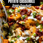 This Buffalo Chicken Sweet Potato Casserole combines tender cubed chicken breasts, roasted sweet potatoes, and broccoli florets tossed in a zesty buffalo sauce, layered and baked to perfection with melted cheddar cheese, crispy turkey bacon, and a drizzle of ranch for a flavorful and satisfying meal perfect for dinner gatherings or meal prep.