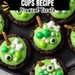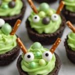 - Decorate: Garnish each filled cookie cup with round green sprinkles, Halloween sprinkles, and candy eyeballs. Break pretzel sticks in half and insert one into each cookie cup as a whimsical stir stick.