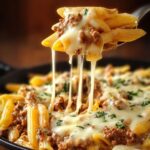 - Add the Cheeses: Stir in mozzarella and Parmesan cheese until they melt completely, creating a creamy cheesy sauce that coats the pasta and beef.
