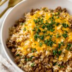 - Assemble the Casserole: In the prepared baking dish, combine the cooked rice, ground beef mixture, half of the shredded cheddar cheese, and the sauce. Mix thoroughly to distribute all ingredients evenly.