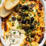 A rich and creamy cheesy baked olive dip perfect for entertaining, combining sour cream, cream cheese, mozzarella, Parmesan, and briny black and green olives for a flavorful appetizer.