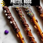 Delicious and festive chocolate covered pretzel rods coated with semi-sweet chocolate and sprinkled with crushed candies, perfect for a sweet and salty treat or party snack.