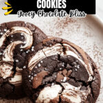 Chocolate Marshmallow Swirl Cookies, chocolate marshmallow cookies, marshmallow swirl cookies, easy chocolate cookie recipe, gooey marshmallow cookies - Two dark brown cookies with white swirls spread on top are placed on a white plate. Each cookie has cracks on its surface and some shiny salt flakes sprinkled over the top. The plate also has a dusting of dark brown powder around the edges. The background is a white marbled texture. photo taken with an iphone --ar 2:3 --v 7