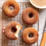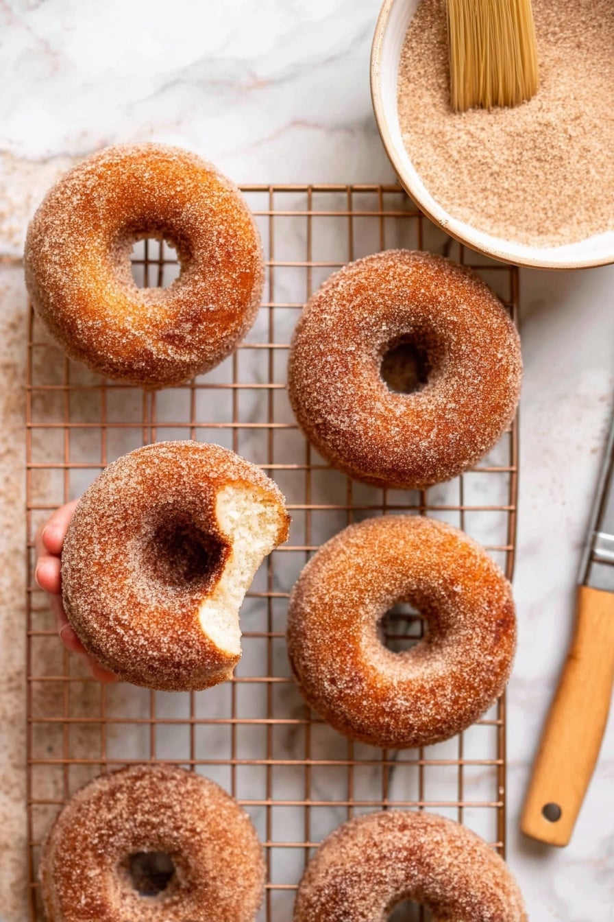 Toss the doughnuts in the cinnamon sugar while they’re still warm but cooled for about 30 seconds. The sugar clings perfectly and forms a delicious, textured coating.