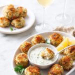 8. Serve: Serve the crab cake poppers hot with the spicy aioli on the side for dipping.