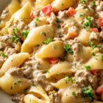 - Garnish and Serve: Sprinkle chopped parsley over the dish for a fresh finishing touch. Serve immediately and enjoy your creamy beef and shells!