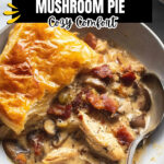 A hearty and comforting Chicken and Mushroom Pie featuring a homemade cream of chicken sauce, tender cooked chicken, sautéed mushrooms, crisp bacon, and cheddar cheese, all encased in flaky puff pastry. Perfect for a satisfying dinner that blends creamy and savory flavors.