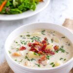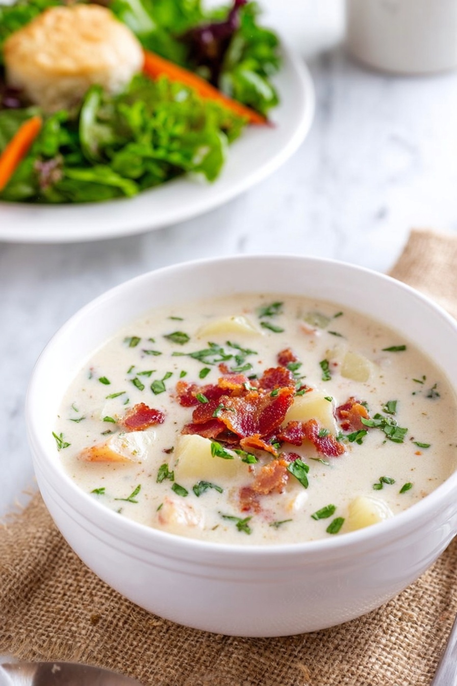This classic clam chowder recipe features crispy bacon, tender potatoes, and a creamy broth enriched with half-and-half and clam juice. Perfectly seasoned with herbs and served with fresh parsley, it’s a comforting and hearty soup ideal for chilly days.