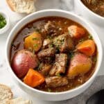 I reheat leftover stew gently on the stove over low-medium heat, stirring occasionally to prevent sticking. If the stew has thickened too much, a splash of broth or water brings it right back to perfect stew consistency. Microwaving works too, just heat in intervals and stir between.