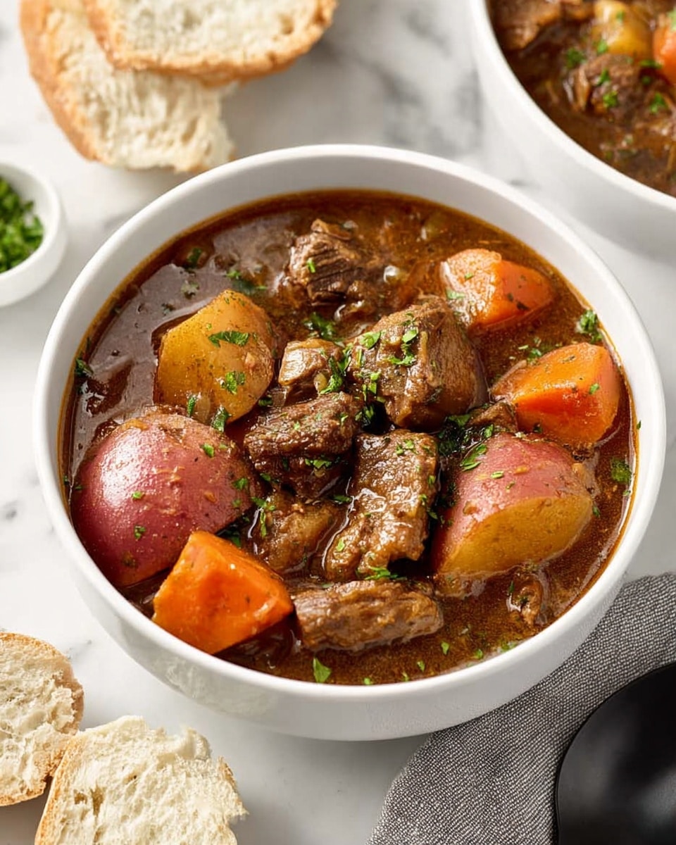 Crusty bread is my go-to to soak up all that savory sauce. If I’m feeling fancy, I pair the stew with a simple green salad lightly dressed with lemon to brighten the meal. Mashed potatoes on the side can be lovely too if you want double the comfort.