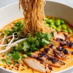 Creamy Marry Me Chicken Ramen is a rich and flavorful dish combining tender pan-fried chicken breasts with a creamy, spiced broth infused with sun-dried tomatoes, garlic, and parmesan. Served over ramen noodles and topped with fresh cilantro, bean sprouts, edamame, scallions, and a drizzle of chili oil for a spicy kick, it’s a delicious fusion recipe perfect for a comforting meal.