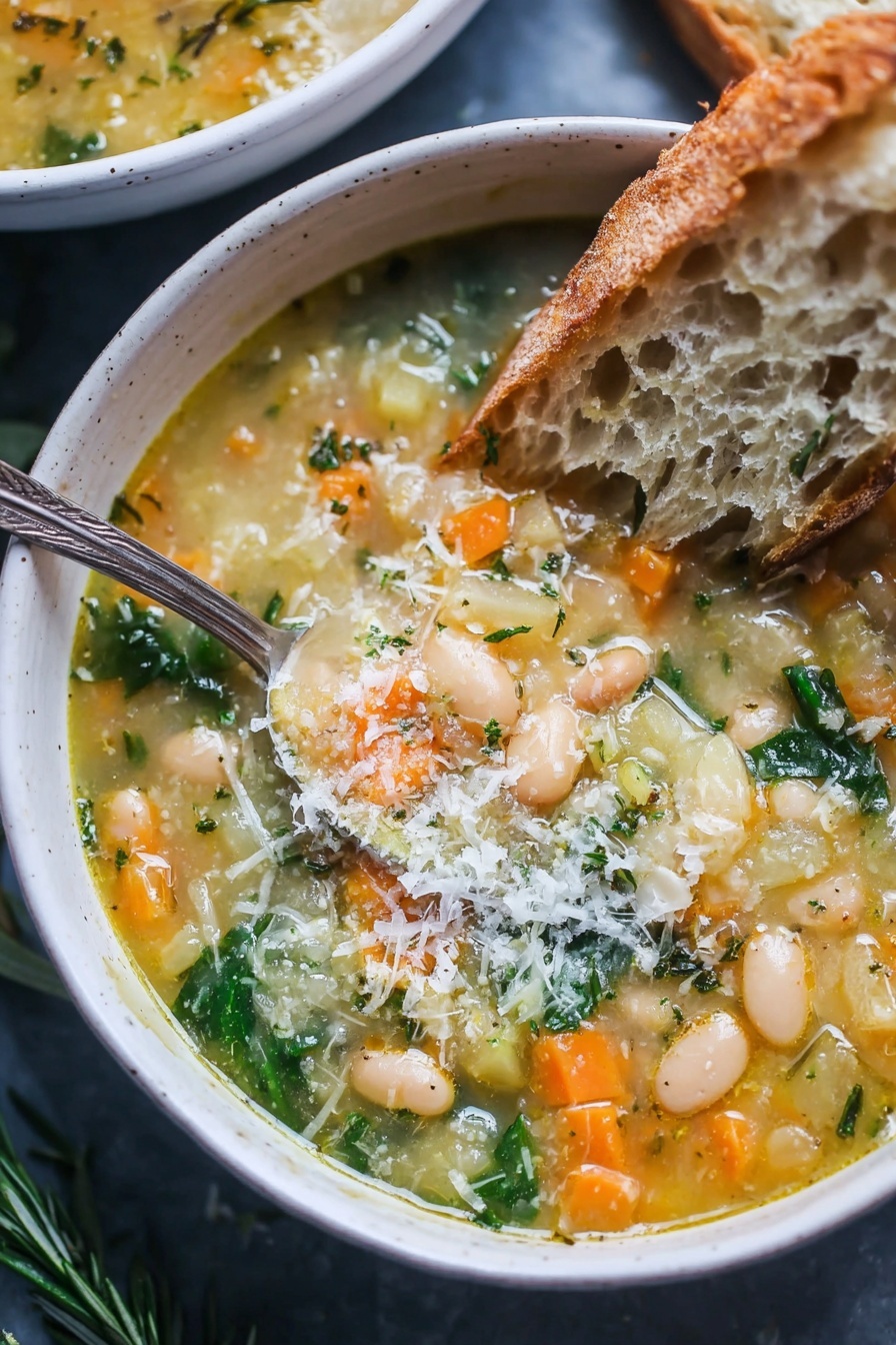 A comforting and hearty White Bean Soup made with tender Cannellini beans, fresh vegetables, and aromatic herbs, blended to a creamy texture and finished with fresh spinach and optional parmesan cheese. Perfect for a nutritious and satisfying meal.