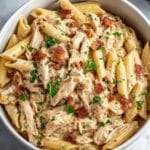 I recommend freezing the sauce and shredded chicken without the pasta to avoid sogginess when reheating. When you’re ready to eat, thaw overnight, warm gently, and stir in freshly cooked pasta for a near-fresh experience.