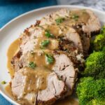 I love topping this pork roast with a sprinkle of fresh chopped parsley for a pop of color and freshness. Sometimes I add a handful of crispy fried onions on top — it adds a nice crunch contrast to the tender meat and silky gravy.