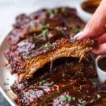 I love topping these ribs with a sprinkle of chopped fresh parsley or green onions for a pop of color and freshness. A few thin slices of pickled jalapeños bring a little brightness and heat that cuts through the richness perfectly.