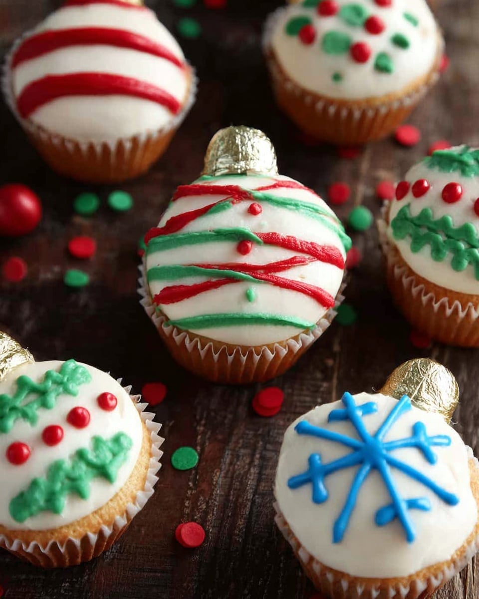 - Decorate Ornaments: Pipe ornament designs onto the frosted cupcakes using the colored frostings to mimic Christmas ornament patterns.
