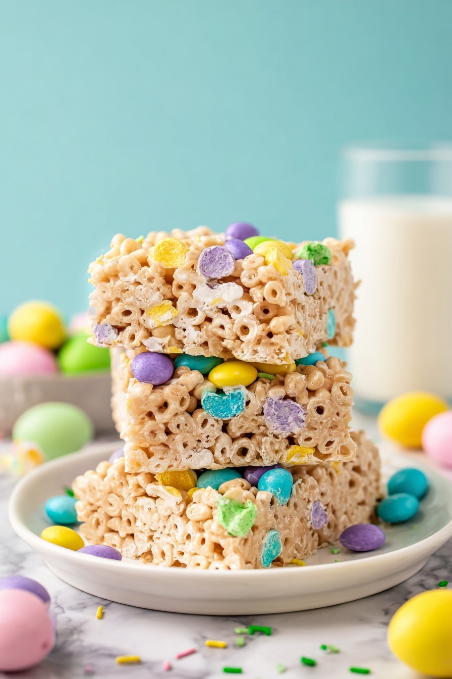 These festive Easter Rice Krispie Treats combine classic marshmallow cereal squares with colorful cereals and fun Easter-themed candies for a delightful, crunchy, and sweet holiday snack perfect for celebrations or parties.