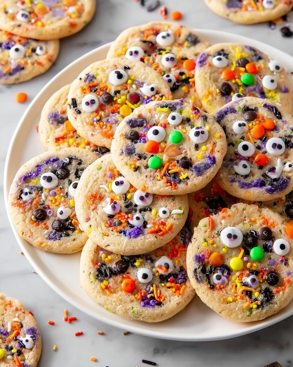 I enjoy placing these cookies on a spooky-themed platter lined with orange and black tissue paper. For parties, I’ve stacked them in clear cellophane bags tied with a Halloween ribbon as cute favors. You can even build a cookie “monsters” platter, combining candy eyes on other treats like cupcakes or brownies for a fun effect!