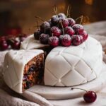 - Decorate (optional): For traditional decoration, roll out marzipan dusted with icing sugar and cover the cooled cake, smoothing pleats. Then roll out fondant and cover the cake similarly. Create a quilted pattern on the sides by pressing with a blunt edge at 45-degree angles and adding silver balls at intersections. Top with cherries dusted with icing sugar.
