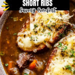 - Serve: Ladle the short rib and onion mixture into bowls. Top each with cheesy toast, freshly ground black pepper, and a sprinkle of fresh thyme leaves. Enjoy hot.
