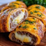 Garlic Butter Cheeseburger Rollups are a delicious and easy-to-make appetizer or snack featuring seasoned ground beef and melted cheddar cheese wrapped in flaky crescent roll dough, brushed with flavorful garlic butter, and baked to golden perfection.