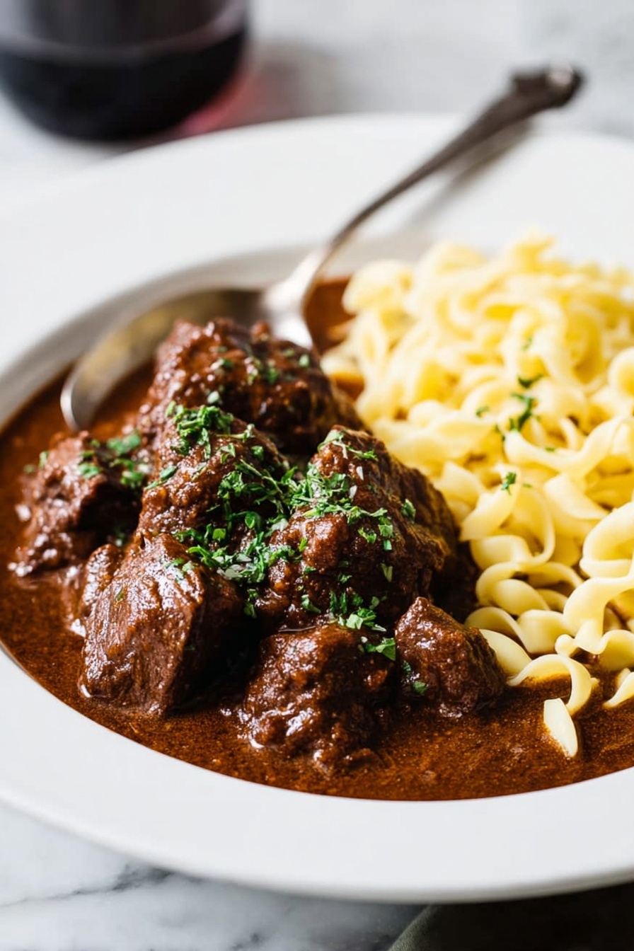 When it’s done, sprinkle over fresh parsley to brighten all those robust flavors. Serve it piping hot with traditional spaetzle, buttered noodles, or rustic boiled potatoes for an authentic, warming experience you can’t beat.