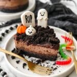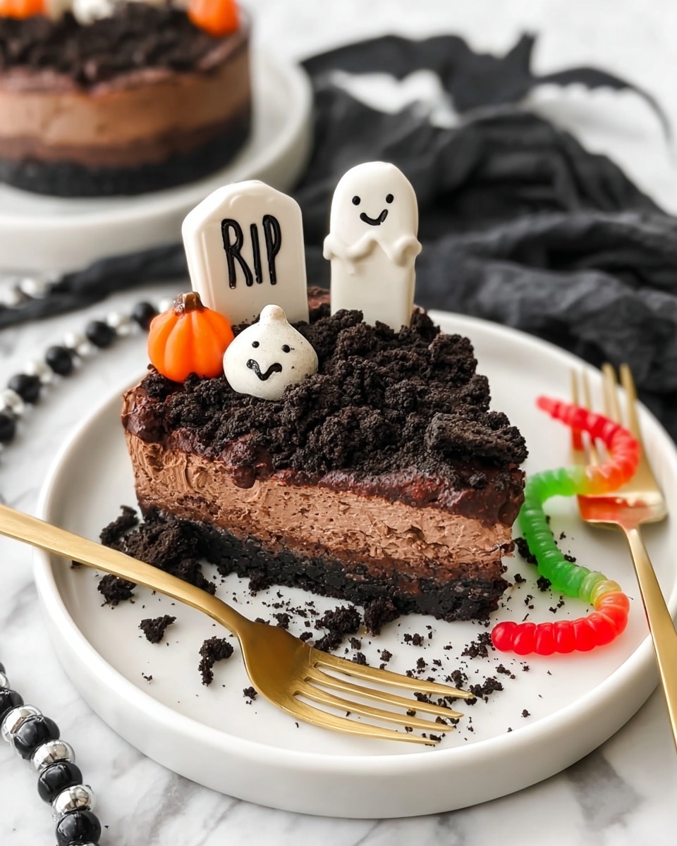 For a crowd-pleasing presentation, I’ve served this dirt cake in clear glass trifle bowls layered in individual cups so everyone gets their own spooky treat. Another fun idea is to build mini graves with tombstone cookies in small mason jars for a super cute grab-and-go option at parties.