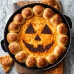 A fun and spooky Halloween Pizza Dip featuring a creamy chicken cheese dip surrounded by cheddar-stuffed dough balls arranged like a monster face. Perfect for festive parties and easy to make with ready-made pizza dough.