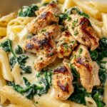 - Combine and Finish. Return the cooked chicken to the skillet and add 2 cups of baby spinach. Stir until the spinach wilts and everything is well combined. If the sauce is too thick, add 1-2 tablespoons of reserved pasta water to adjust consistency. Toss in the cooked pasta until evenly coated with sauce.