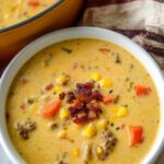 A hearty and flavorful Cowboy Soup featuring ground beef, potatoes, beans, and melted cheese, perfect for a comforting meal that serves 8.