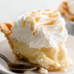 This pie is best served chilled, so reheating isn’t needed. If you want a slightly softer filling after refrigeration, just let the pie sit out at room temperature for about 15 minutes before slicing—this softens the custard perfectly without melting the whipped cream.