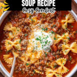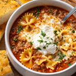 A hearty and comforting Lasagna Soup that combines the rich flavors of traditional lasagna with the ease and warmth of a soup, perfect for cozy meals. This recipe features ground beef, bowtie pasta, and a blend of tomato products and Italian seasonings, topped with a mix of ricotta, mozzarella, and parmesan cheeses.