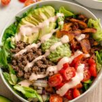 Now for the fun part! I chop up romaine lettuce and spread it into my serving bowls, then pile the browned beef right in the center. Around it, I arrange cherry tomatoes, pickle chips, crumbled thick-cut bacon, sautéed onions, and spoonfuls of guacamole. Finally, I drizzle that luscious special sauce all over the top and serve immediately. The combo of textures and flavors at this point is just… chef’s kiss.
