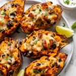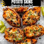 - Serve: Remove from the oven and top with vegan coconut bacon. Serve alongside extra vegan yogurt and lime wedges for squeezing. Enjoy your loaded sweet potato skins warm!