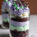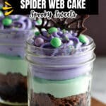 Delightfully fun and festive Mason Jar Cakes made with rich Devils Food Chocolate Cake, layered with creamy marshmallow frosting tinted in vibrant purple and green, topped with chocolate spider web decorations and sprinkles. Perfect for parties, gifts, or a charming dessert presentation.