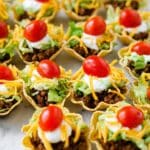 I don’t recommend freezing the fully assembled mini taco bites because the chips lose their crunch and veggies get soggy. However, you can freeze the cooked taco meat on its own, which saves prep time for future snacks.