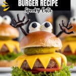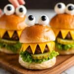 Monster Burgers are fun and flavorful beef burgers creatively decorated with olive and mozzarella eyes, cheddar cheese teeth, fresh tomato slices, lettuce, and pickles for a playful meal perfect for any burger lover looking to add some whimsy to their dinner table.