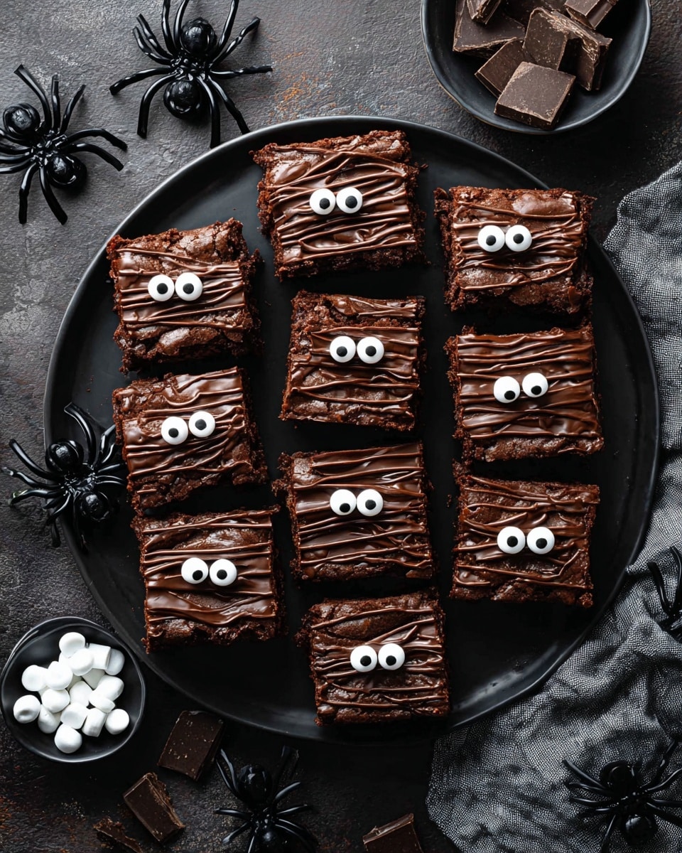 One year, I arranged the mummy brownies on a large platter surrounded by fake spider webs, plastic spiders, and a few dry ice chunks for spooky fog—instant Halloween drama! You can also serve them in individual cupcake liners for easy grab-and-go treats.