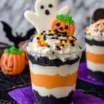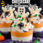 Delightfully festive and easy to make, these No Bake Halloween Cheesecake Cups combine creamy cheesecake layers with Oreo cookie crumbs and colorful Halloween-themed decorations for a fun and spooky treat perfect for parties and celebrations.