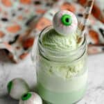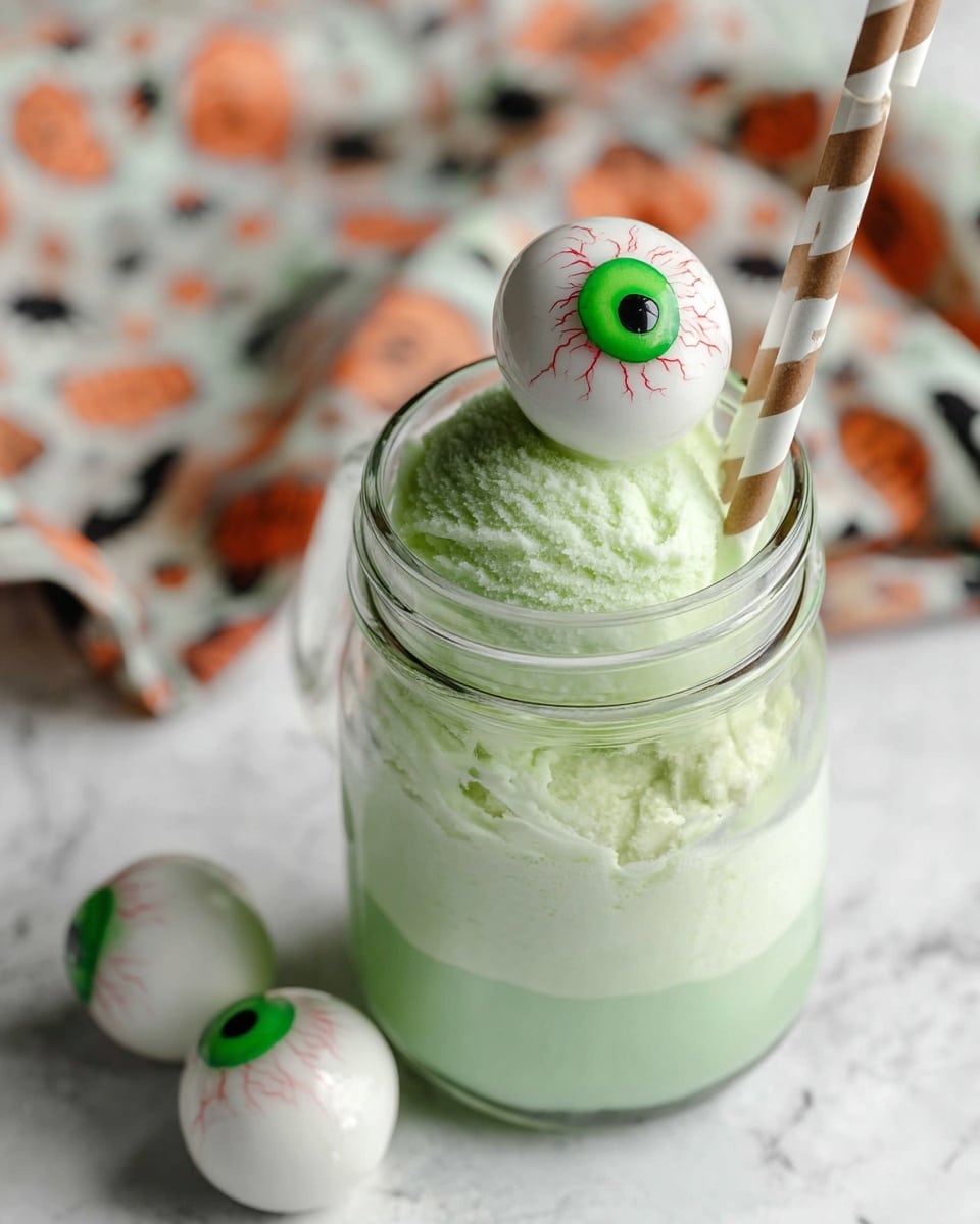 A clear glass jar is filled with a light green creamy drink topped with a thick layer of white foam. On top, there is a scoop of light green ice cream with a white candy eyeball featuring a green iris, black pupil, and red veins resting on it. A white and brown striped paper straw is placed in the jar beside the ice cream. The jar sits on a white marbled surface, and a Halloween-themed cloth with black bats and orange pumpkins is partially visible in the background. Photo taken with an iphone --ar 4:5 --v 7