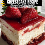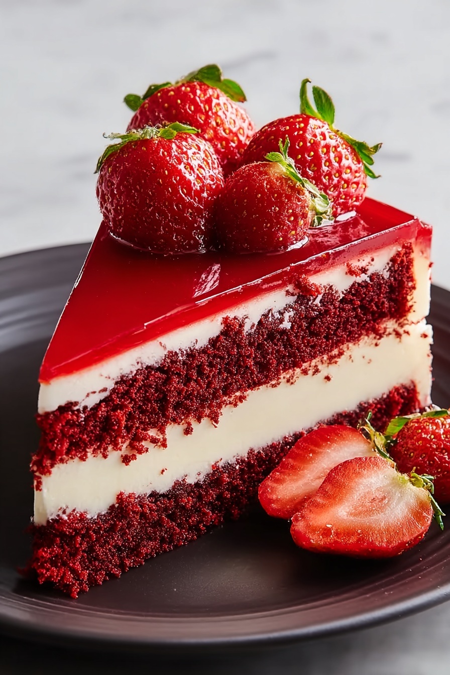 A decadent Red Velvet Strawberry Cheesecake recipe featuring a moist red velvet cake base topped with a creamy cheesecake layer and finished with a luscious strawberry preserves glaze and fresh strawberry garnish. Perfect for special occasions and dessert lovers seeking a rich, flavorful treat.