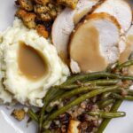 Once done, let the turkey rest for 10 minutes before slicing—it helps keep the meat tender and juicy. Then serve that gorgeous turkey over the stuffing and enjoy the satisfying flavors you worked for!