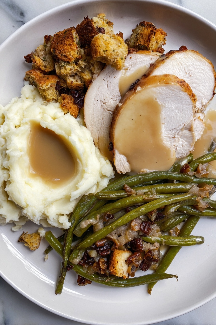 I like to finish this dish with a sprinkle of fresh parsley or thyme leaves—it adds a pop of color and a fresh herbal note that brightens the richness. Sometimes a little drizzle of pan juices over the turkey and stuffing just before serving takes it up another notch.