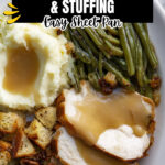 9. Serve: Remove from oven, let rest a few minutes, then slice the turkey and serve it alongside the stuffing. Enjoy your comforting sheet pan turkey and stuffing dish!